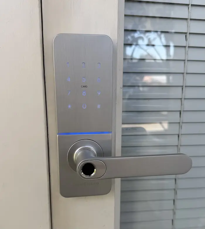 - Sleek door lock with a Bluetooth App, Fingerprint, pin code, swipe card/fob, and manual key to provide quick and convenient access.
